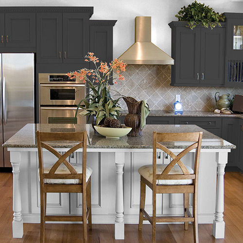 White and dark gray are excellent complementary colors to use when painting your kitchen cabinets. Incorporate both these paint colors in your kitchen by painting the top cabinets a white paint color and the lower cabinets a gray paint color. The white paint color will reflect sunlight, brightening your kitchen and making it more lively and beautiful. Gray paint color on lower cabinets make them easier to clean, keeping your kitchen cabinets spotless and pretty.See All Gray Paint Colors