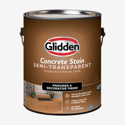Glidden® Semi-Transparent Concrete Stain is for use on concrete porches, patios, pool decks, walkways, driveways, garage, and basement floors. It is easy to apply, and provides a decorative finish. Hot Tire & UV resistance make it a great product for driveways, garage floors, and pool decks. This product stains and seals for a durable finish.