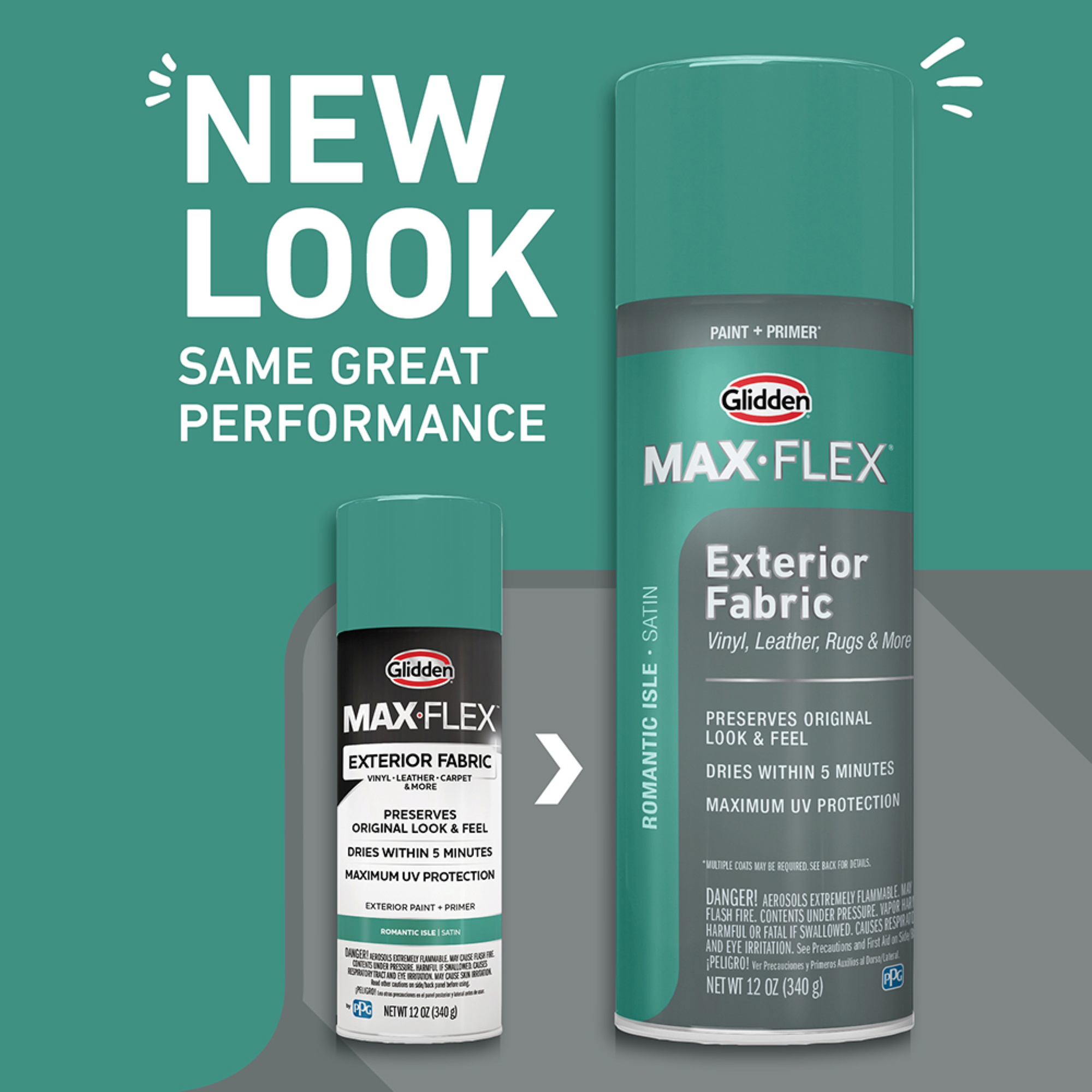Glidden® Max-Flex Exterior Fabric is an exterior paint + primer spray paint with revolutionary technology that provides maximized UV protection for exterior fabrics like vinyl, leather, rugs, and more.  Glidden Max-Flex provides exceptional coverage while preserving the original look and feel of your item.  The unique spray pattern provides a broader, smoother finish. It covers surfaces with fewer spray passes than a traditional conical shaped spray pattern and dries within 5 minutes with a flawless, durable finish, so you can take on your projects with confidence.