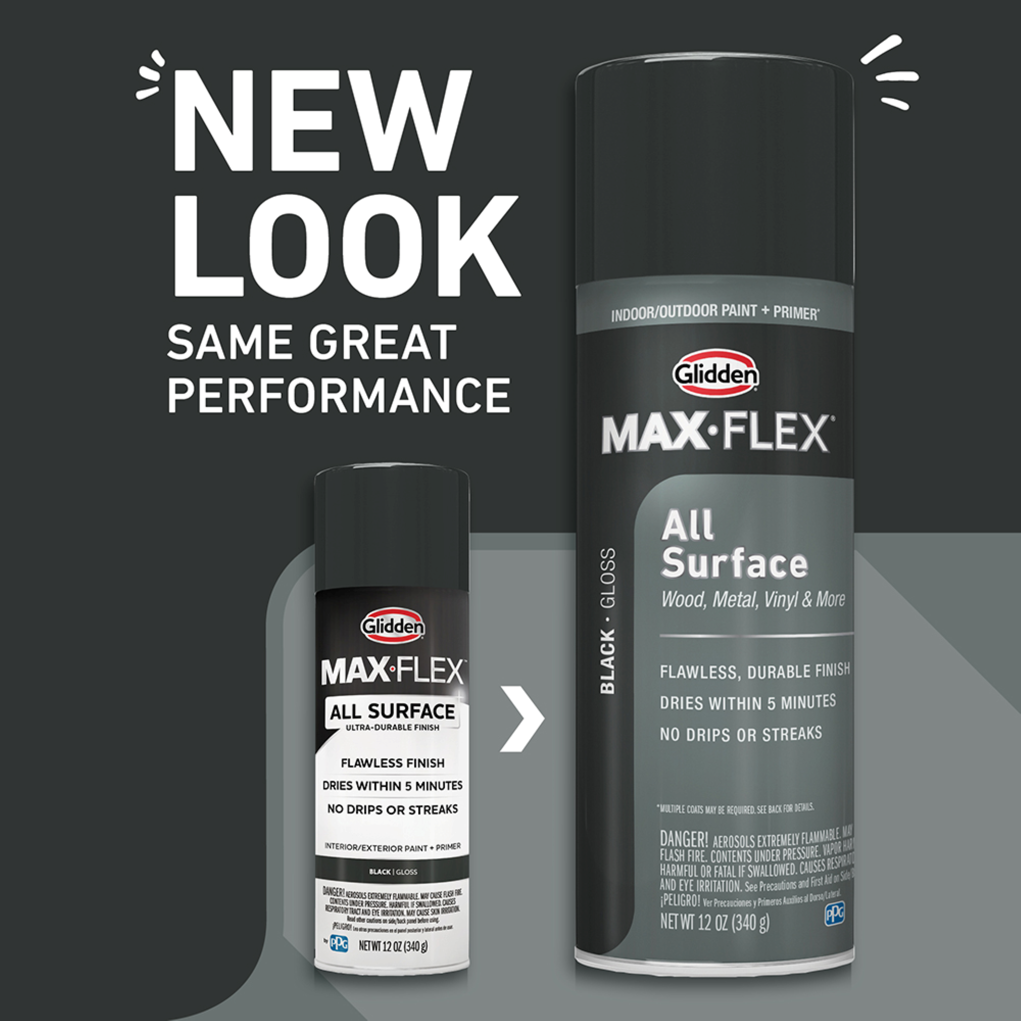 Glidden® Max-Flex™ All Surface is an interior/exterior paint + primer spray paint with revolutionary technology that provides exceptional coverage. It provides an ultra-durable finish on a wide range of surfaces like wood, metal, plastic, glass and more. Glidden Max-Flex has a unique spray pattern for a broader, smoother finish for no drips or streaks. It covers surfaces with fewer spray passes than a traditional conical shaped spray pattern and dries within 5 minutes. Its flawless, durable finish allows you to take on your projects with confidence.